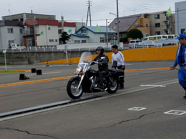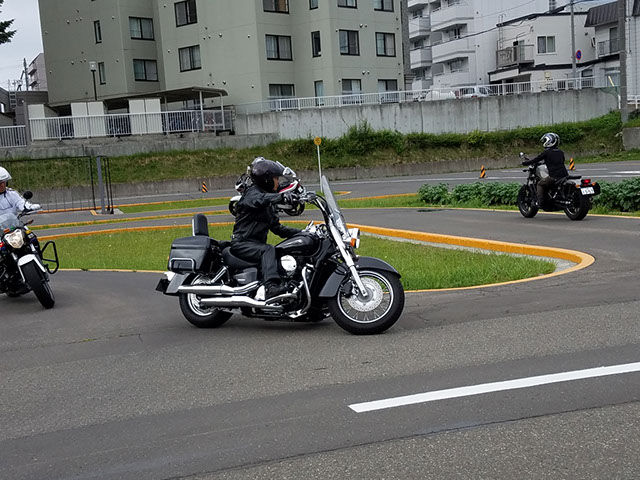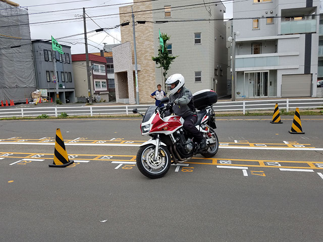 また、ツーリングではよくある場面の「Uターン」のコツを学び、教習車をお借りしての最小ターンの練習。