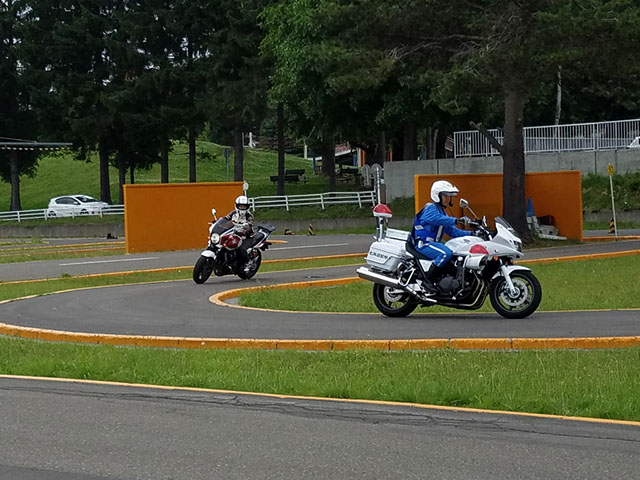 午前中は、白バイ隊員によるブレーキ特性を実際に見た上で、自分たちも体験。普段出来ないブレーキングを体験しました。